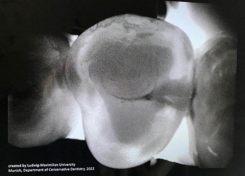 Fasci di luce attraversano i denti, la struttura dentale sana appare sullo schermo molto traslucente mentre le carie assumono un colore scuro dovuto alla difficolta della luce ad attraversarle.